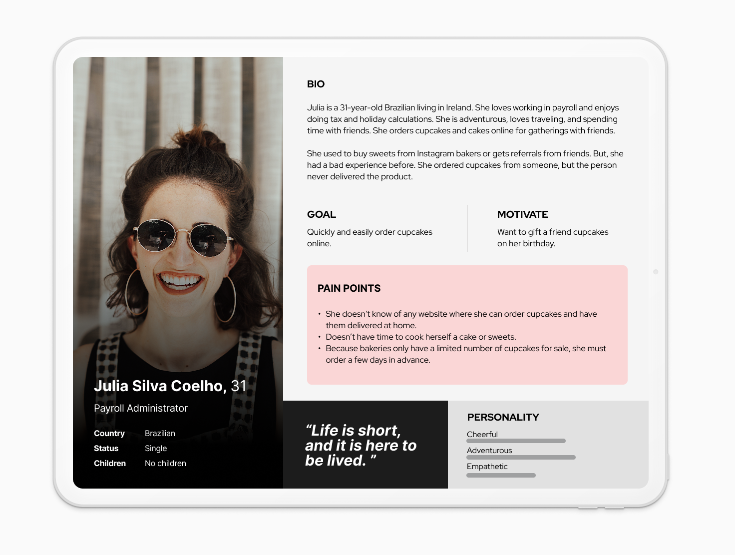 Based on the research, I found the primary persona: Julia, 31, a payroll assistant, enjoys gifting and ordering sweets online